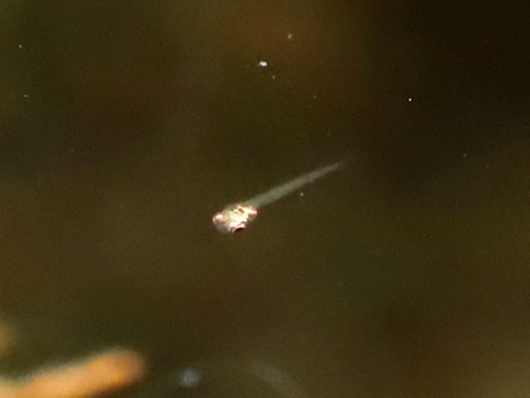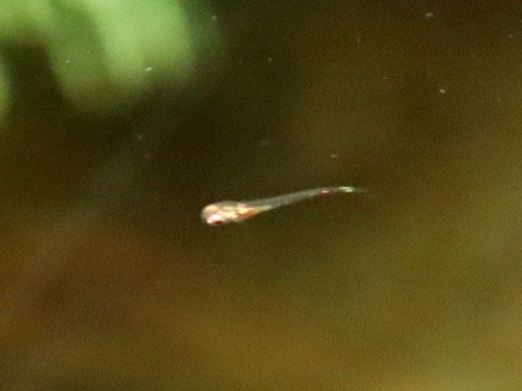 2日目、3匹の稚魚を発見。(左)ガラス面に張り付いた稚魚。残念ながら、これは育ちませんでした。(右)水面直下を泳ぐ別の稚魚。